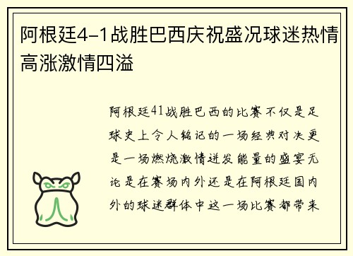 文章摘要:阿根廷足球的生死战是一个关于精神、奋斗与荣耀的传奇故事。在世界杯赛场上,阿根廷球队凭借其顽强的反击精神与对荣耀的追寻,展示了无畏和决不放弃的态度。这篇文章将从四个方面深入探讨阿根廷生死战背后的反击精神与荣耀追寻。首先,通过阿根廷球员的拼搏与坚韧,展现了他们如何在困境中反败为胜。其次,球队的...